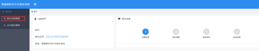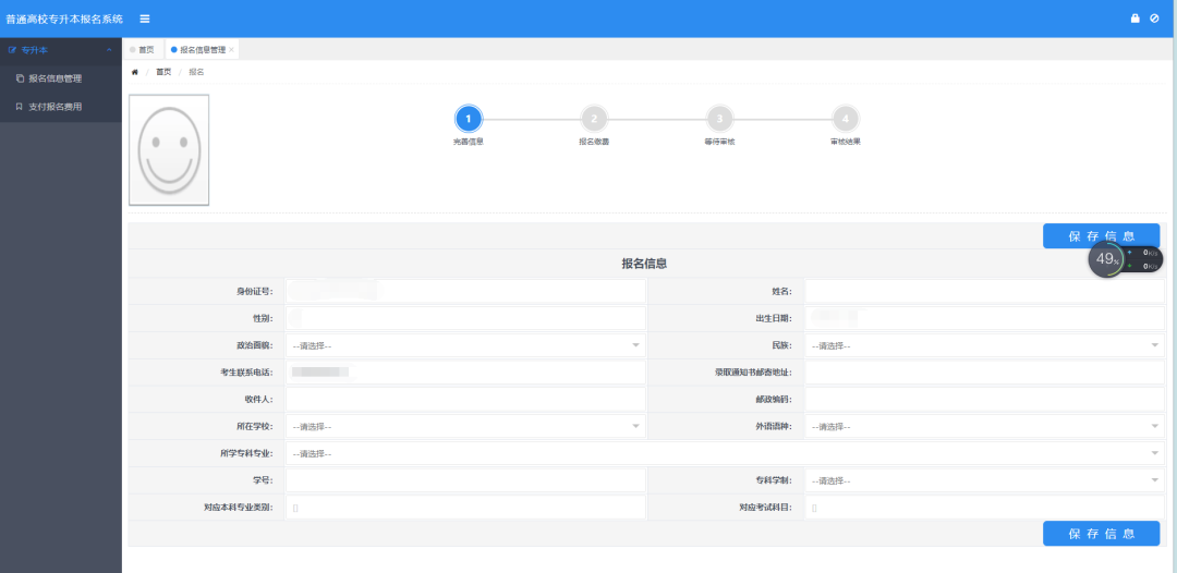 1.报名。点击左侧菜单进入【报名信息管理】,填写信息并确认无误后点击【保存信息】,进入缴费页面。在报名审核通过之前或审核不通过后都可以修改报名信息。