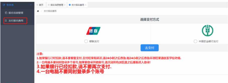 2.缴费。在报名信息后或者点击左侧【支付报名费用】进入缴费页面。选择对应方式后点击【去支付】跳转到银行系统进行缴费。